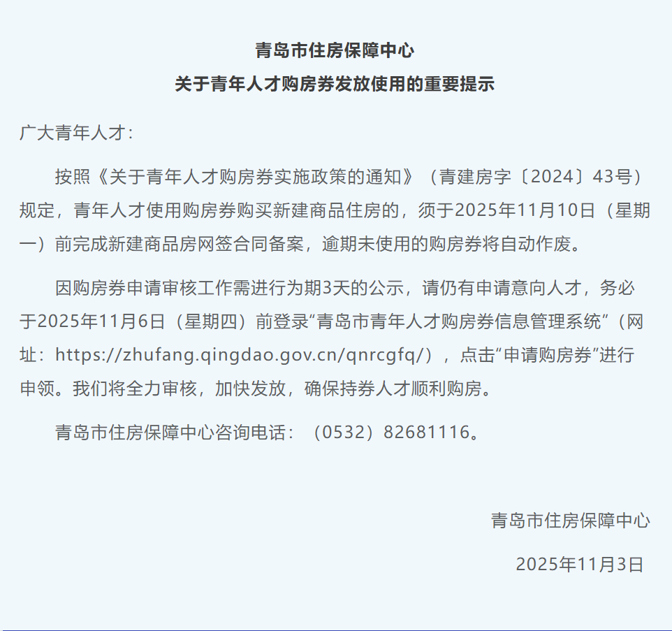11月3日,青岛市住房保障中心发布了关于青年人才购房券发放使用的重要提示:按照《关于青年人才购房券实施政策的通知》(青建房字〔2024〕43号)规定,青年人才使用购房券购买新建商品住房的,须于2025年11月10日(星期一)前完成新建商品房网签合同备案,逾期未使用的购房券将自动作废。