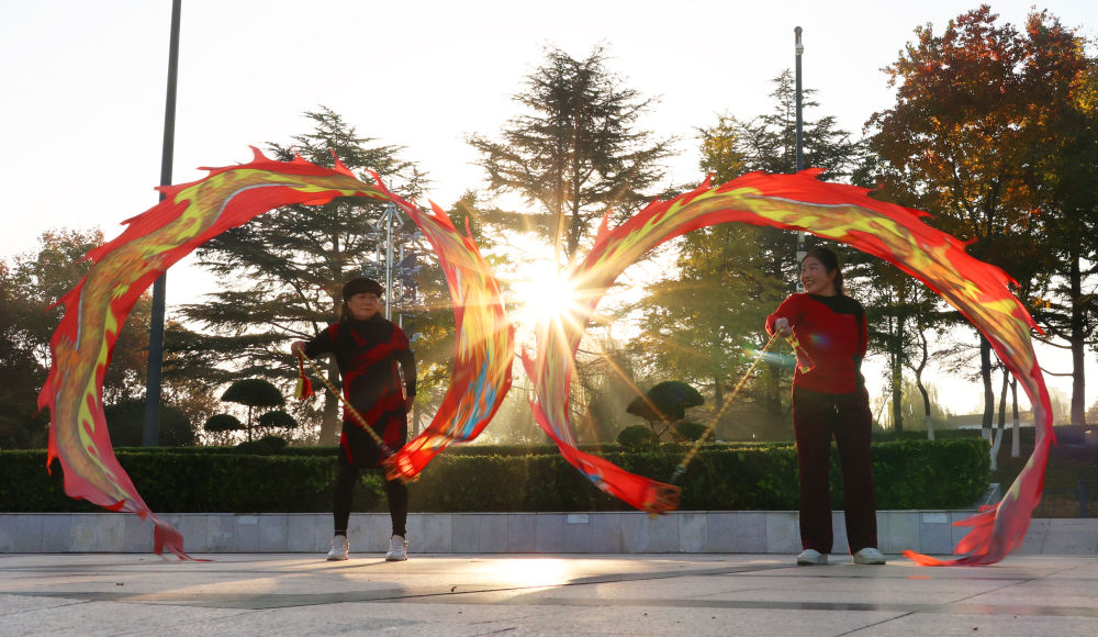 ↑11月10日,在江苏省连云港市海州区苍梧绿园,市民舞绸龙晨练。