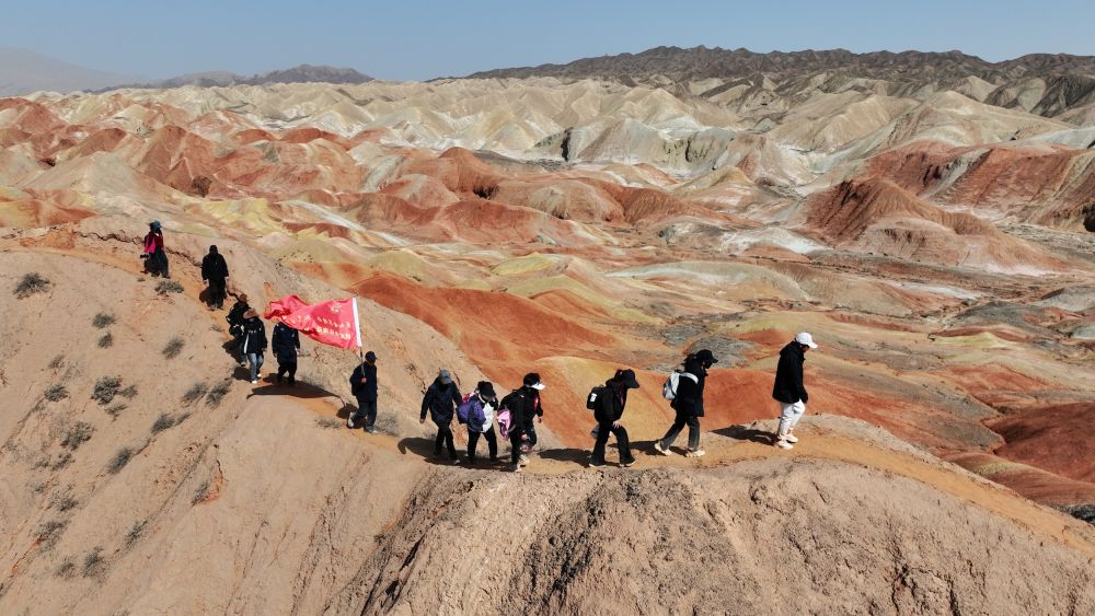 ↑4月4日,徒步爱好者在甘肃省张掖市七彩丹霞景区外围彩色丘陵行进(无人机照片)。