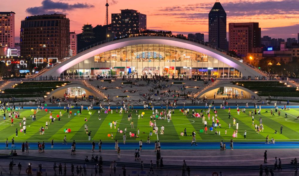 ↑8月9日傍晚,市民在威海市海港湾海上运动场健身(无人机照片)。