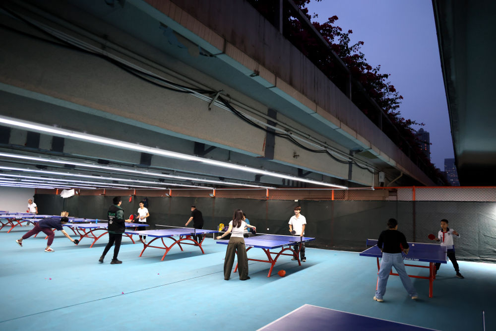 ↑11月3日,市民在位于广州市二沙岛的广州大桥桥底乒乓球场打球。