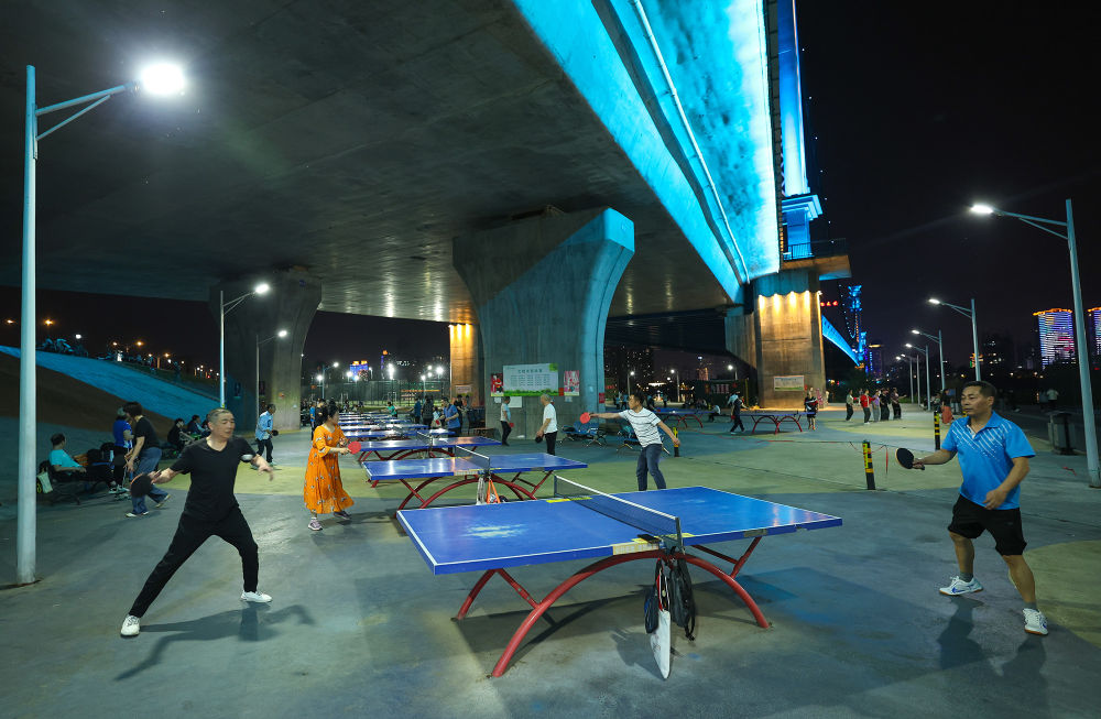 ↑4月22日晚,市民在湖北省襄阳市凤雏大桥下的运动场地打乒乓球。
