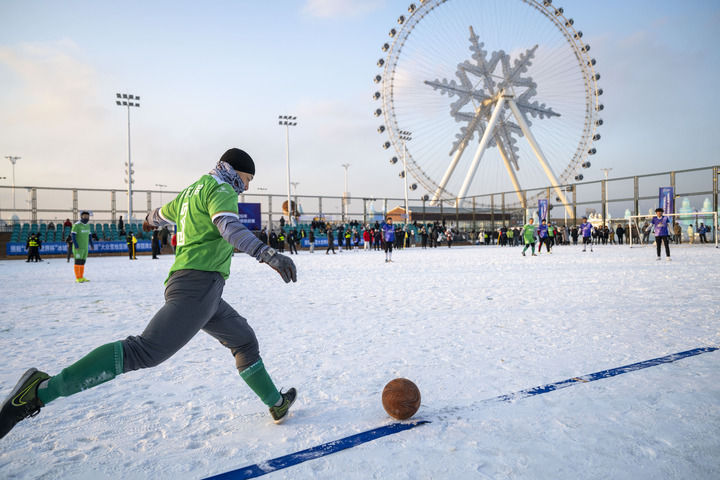 ↑12月20日,参赛球员们在哈尔滨“冰雪大世界杯”2025-2026年冰城首届“冰雪绿茵”大众雪地足球挑战赛中。