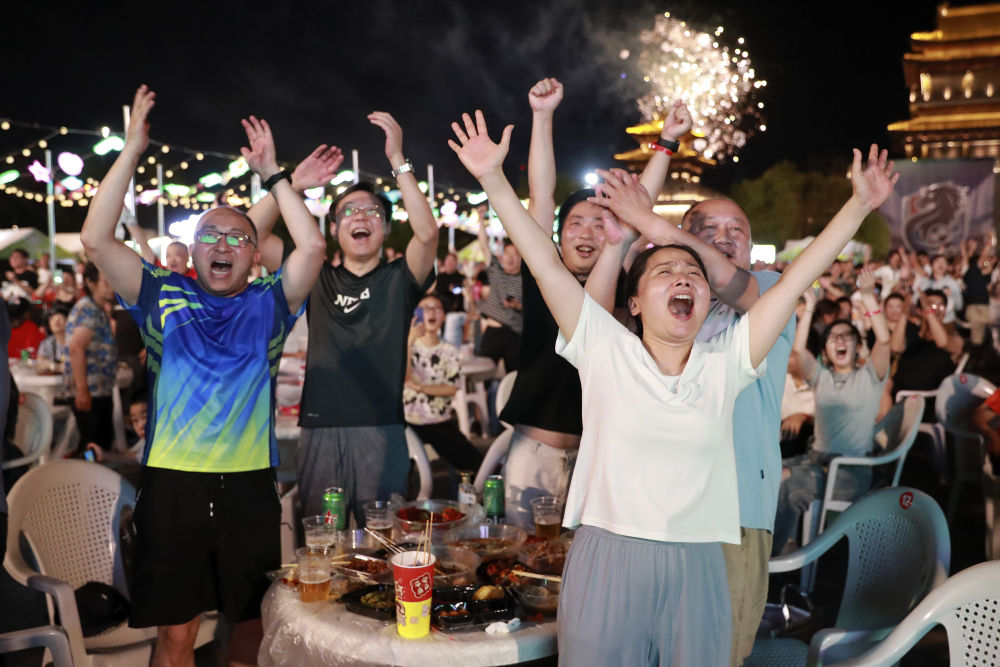 ↑7月20日,球迷在淮安市漕运门广场观看“苏超”淮安队对阵无锡队的比赛。
