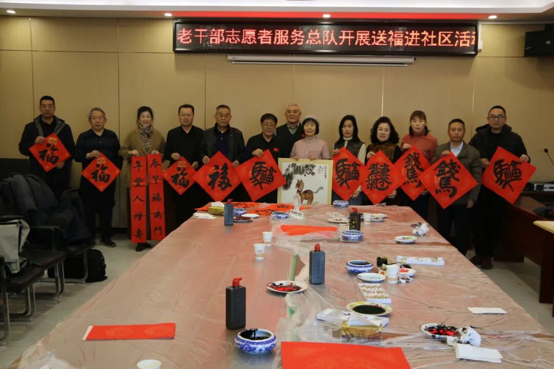 1月8日上午,区老干部志愿者服务总队组织书法、绘画直属服务队老干部志愿者到蓝村街道振兴社区开展“新春送福”送文化进社区活动。