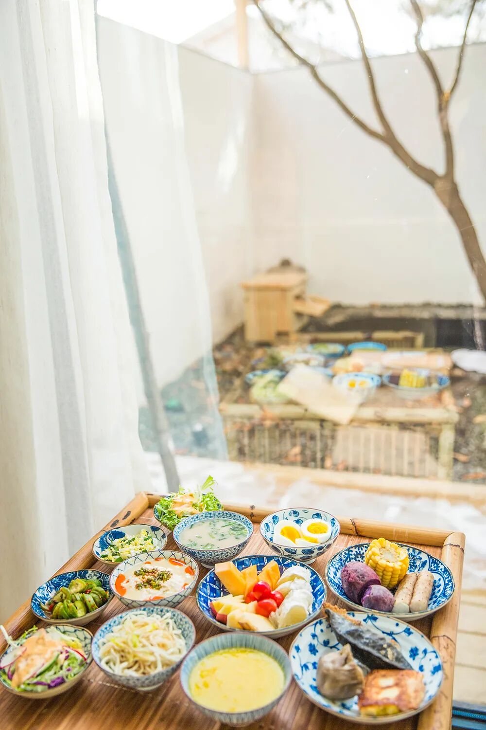 汤屋所供茶点,是精致与克制的平衡;原生态茶饮,可供选择的咖啡与红酒,为山中消假的时光增添了更多醇厚滋味。