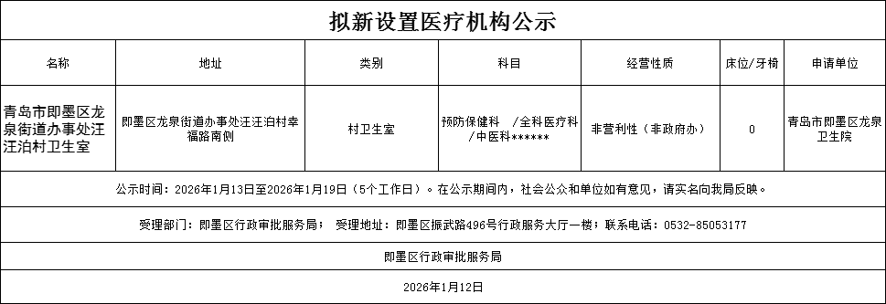 青岛市即墨区龙泉街道办事处汪汪泊村卫生室拟新设置医疗机构公示