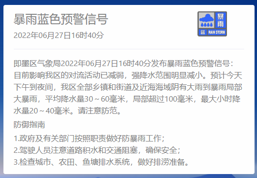 解除暴雨红色预警信号,发布暴雨蓝色预警信号!