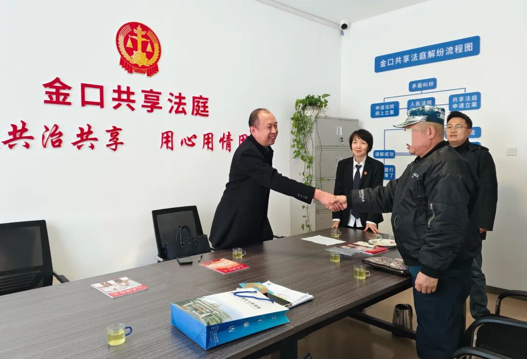 第一次庭审结束后,为尽快化解纠纷,金口镇工作人员主动配合王冬梅庭长团队,协助做好双方当事人的沟通协调工作,通过电话沟通等方式,一边协助梳理案情,一边耐心安抚双方情绪。功夫不负有心人,在镇街工作人员与法官的一次次真诚沟通与疏导下,双方当事人放下芥蒂,达成调解。随后,金口镇协助王冬梅团队再次组织双方来到金口共享法庭,现场确认调解方案细节。当天,卢大爷便一次性向柳老太付清全部款项,纠纷得以实质性化解,双方握手言和,重拾和睦。