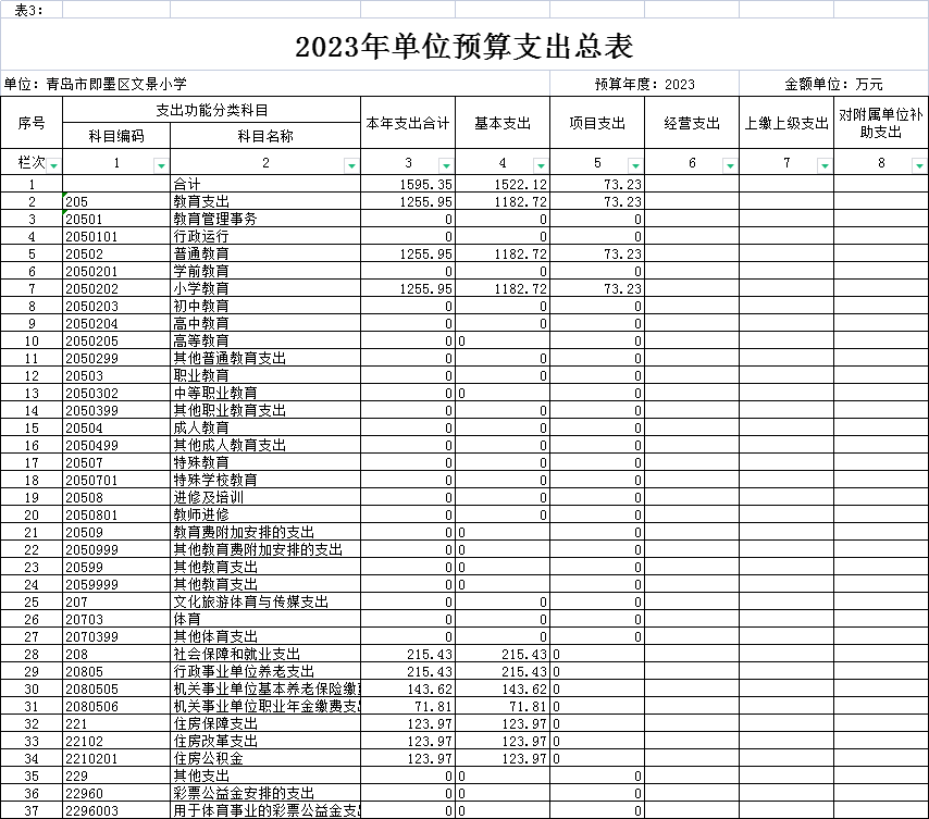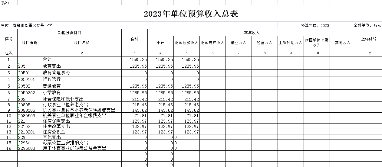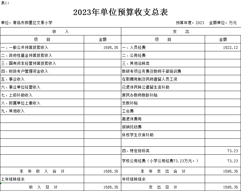 按照综合预算的原则,青岛市即墨区文景小学所有收入和支出均纳入单位预算管理。按照收支平衡原则,青岛市即墨区文景小学2023年收支总预算均为1595.35万元,其中单位收入包括:一般公共预算拨款收入;支出包括:教育管理事务、行政事业单位养老支出、住房公积金等。