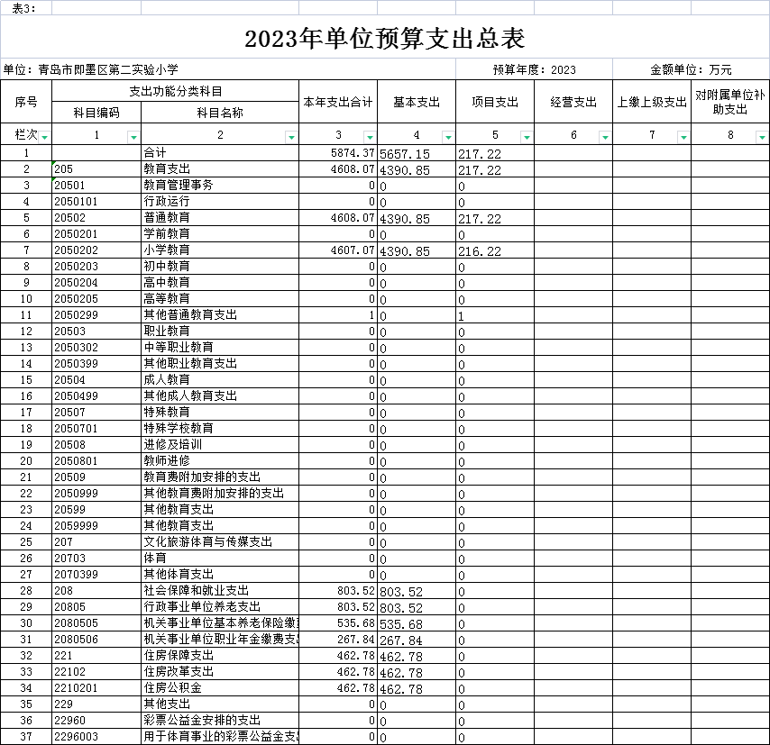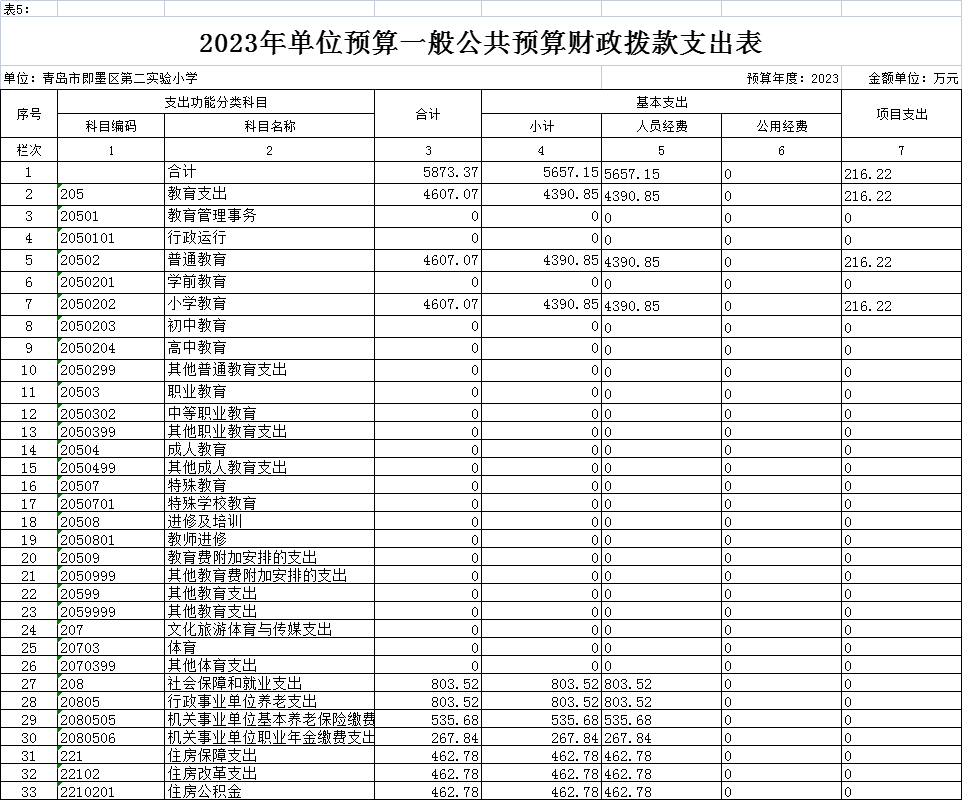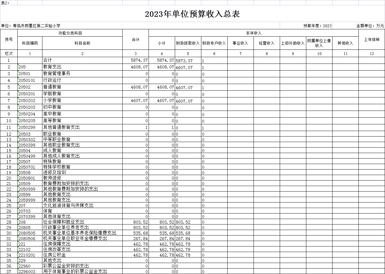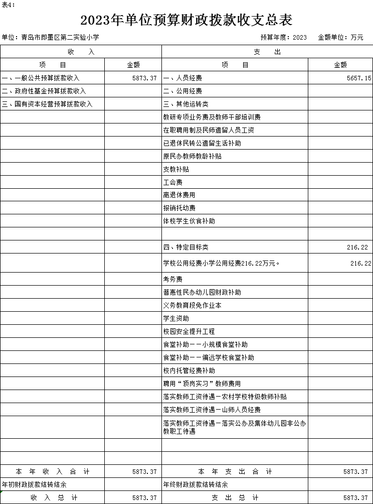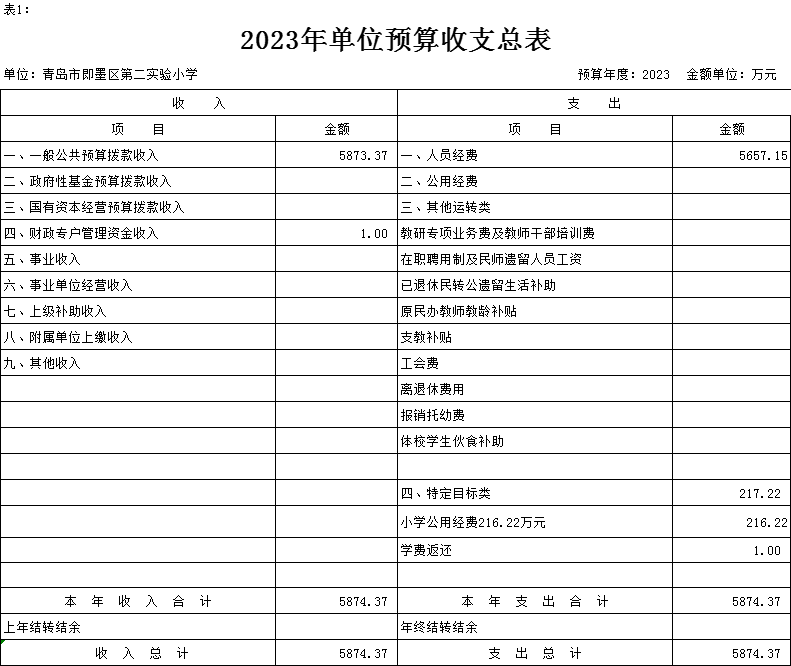 按照综合预算的原则,青岛市即墨区第二实验小学所有收入和支出均纳入单位预算管理。按照收支平衡原则,青岛市即墨区第二实验小学2023年收支总预算均为5874.37万元,其中单位收入包括:一般公共预算拨款收入、财政专户管理资金收入;支出包括:教育支出、社会保障和就业支出、行政事业单位养老支出、机关事业单位职业年金缴费支出、住房保障支出、住房公积金等。