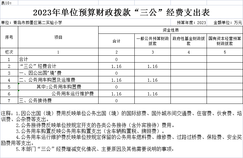 2023年,通过财政拨款安排的“三公”经费预算共1.16万元,比2022年增加74%。公务用车运行维护费1.16万元,与上年比较,增加主要是车辆维修及加油。