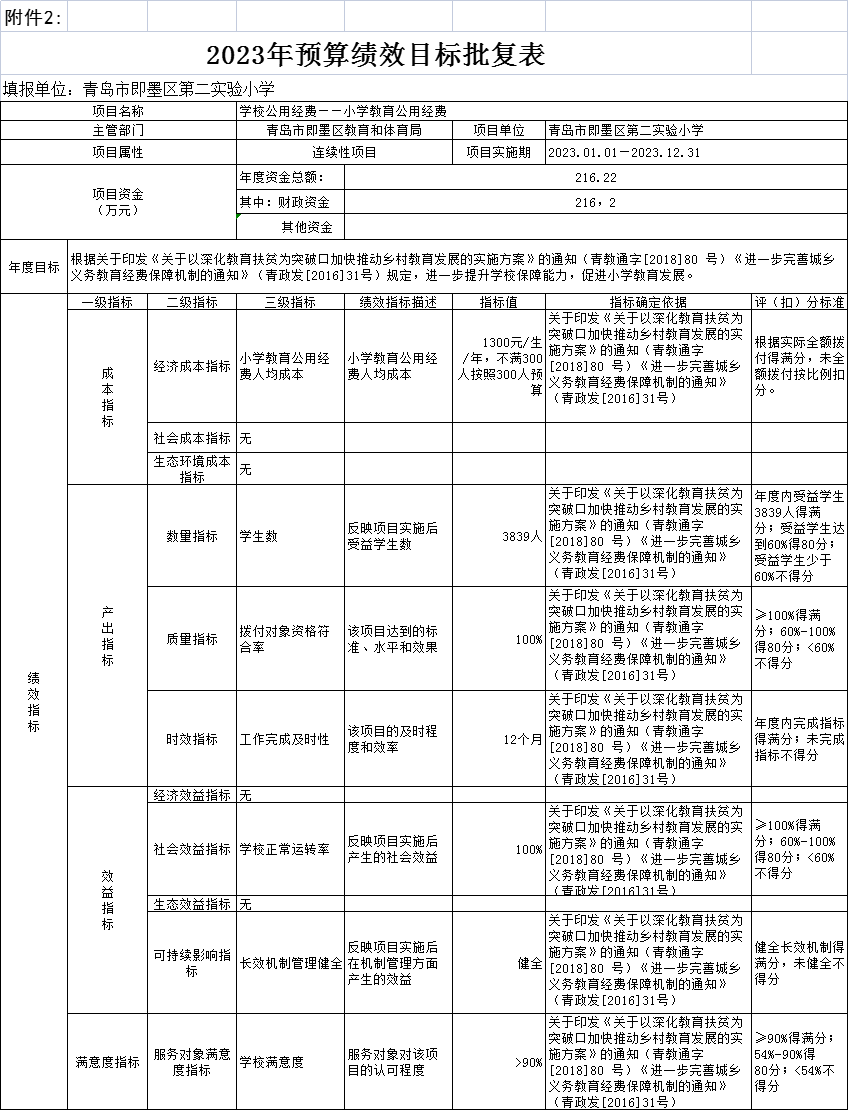 学校公用经费——小学教育公用经费项目:绩效目标情况根据关于印发《关于以深化教育扶贫为突破口加快推动乡村教育发展的实施方案》的通知(青教通字[2018]80 号)《进一步完善城乡义务教育经费保障机制的通知》(青政发[2016]31号)规定,进一步提升学校保障能力,促进小学教育发展。含项目概况、立项依据关于印发《关于以深化教育扶贫为突破口加快推动乡村教育发展的实施方案》的通知(青教通字[2018]80 号)《进一步完善城乡义务教育经费保障机制的通知》(青政发[2016]31号)、实施主体青岛市即墨区第二实验小学、实施周期2023年1月1日-12月31日、年度预算安排5874.37万元、绩效目标进一步提升学校保障能力,促进小学教育发展。包括成本、产出、效益、满意度等指标指标。根据实际全额拨付得满分,未全额拨付按比例扣分。年度内受益学生3839人得满分;受益学生达到60%得80分;受益学生少于60%不得分≥100%得满分;60%-100%得80分;<60%不得分年度内完成指标得满分;未完成指标不得分≥100%得满分;60%-100%得80分;<60%不得分健全长效机制得满分,未健全不得分≥90%得满分;54%-90%得80分;<54%不得分。