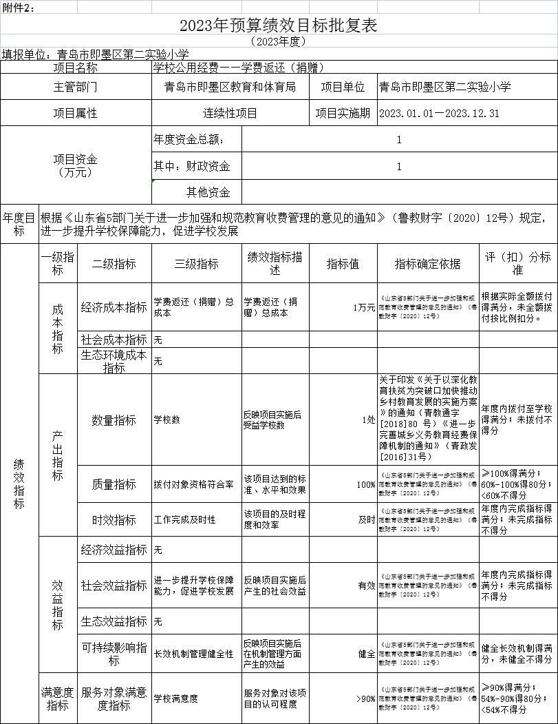 小学教育公用经费--学费返还(捐赠)项目:绩效目标情况根据《山东省5部门关于进一步加强和规范教育收费管理的意见的通知》(鲁教财字〔2020〕12号)、实施周期2023年1月1日-12月31日、年度预算安排1万元、绩效目标进一步提升学校保障能力,促进学校教育发展。包括成本、产出、效益、满意度等指标指标。根据实际全额拨付得满分,未全额拨付按比例扣分。年度内受益学校1处拨付得满分;未拨付不得分。拨付对象资格符合率≥100%得满分;60%-100%得80分;<60%不得分。工作完成及时性,年度内完成指标得满分;未完成指标不得分。进一步提升学校保障能力,促进学校发展,年度内完成指标得满分;未完成指标不得分。长效机制管理健全性,健全长效机制得满分,未健全不得分。学校满意度,≥90%得满分;54%-90%得80分;<54%不得分。