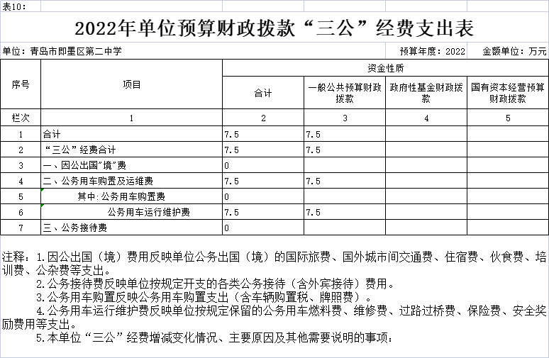 2022年,通过财政拨款安排的“三公”经费预算共7.5万元,比2021年减少30.56%(或是与上年持平)。其中:因公出国(境)经费0万元,与2021年相比无增减变化。公务用车运行维护费和购置费7.5万元,公务用车运行维护费7.5万元,与2021年相比,减少3.3万元,主要原因落实压减三公经费支出政策;公务用车购置费0万元,与2021年相比无增减变化。公务接待费0万元,与2021年相比无增减变化。