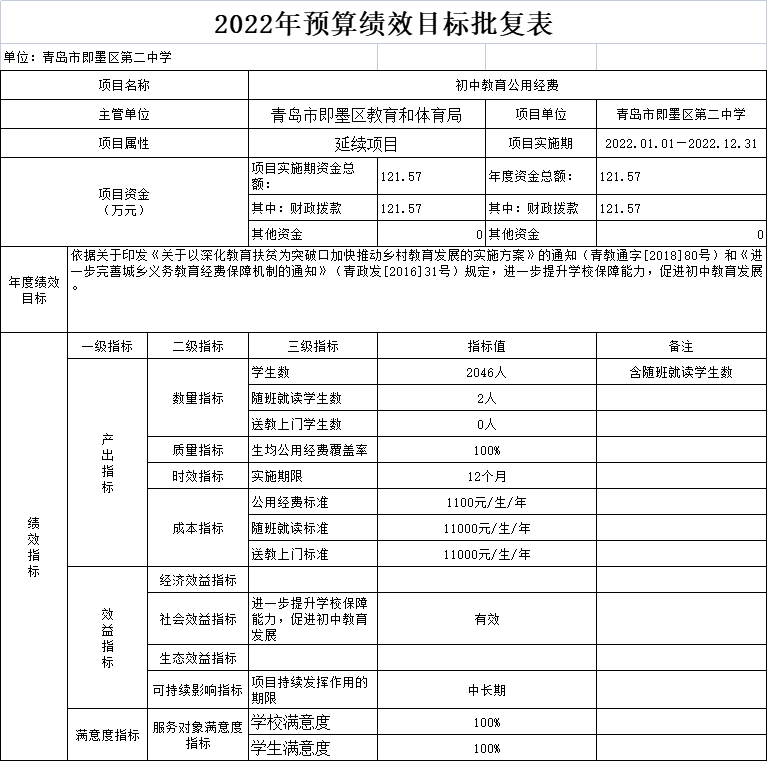 1.初中公用经费:由青岛市即墨区第二中学实施,实施周期为一年,年度预算安排公用经费121.57万元,学生数2046人,公用经费标准1100元/生/年,随班就读11000元/生/年,生均公用经费覆盖率100%,公用经费拨付时效及时。依据《关于以深化教育扶贫为突破口加快推动乡村教育发展的实施方案》的通知(青教通字[2018]80号)和《进一步完善城乡义务教育经费保障机制的通知》(青政发[2016]31号规定,进一步提升学校保障能力,促进初中教育发展。
