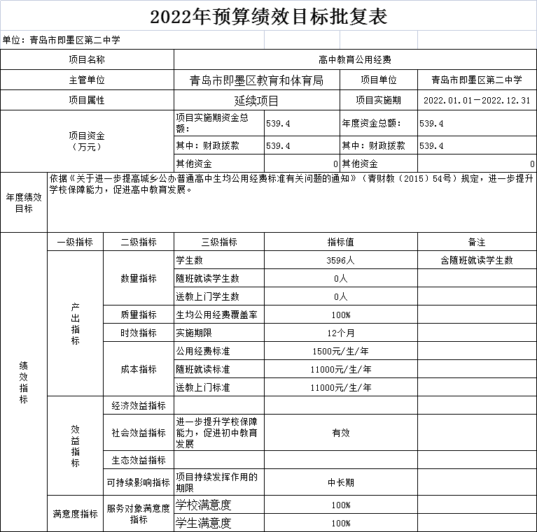 2.高中公用经费:由青岛市即墨区第二中学实施,实施周期为一年,年度预算安排539.4万元,学生数3596人,公用经费标准1500元/生/年,生均公用经费覆盖率100%,公用经费拨付时效及时。依据《关于进一步提高城乡公办普通高中生均公用经费标准有关问题的通知》(青财教〔2015〕54号)规定,进一步提升学校保障能力,促进高中教育发展。