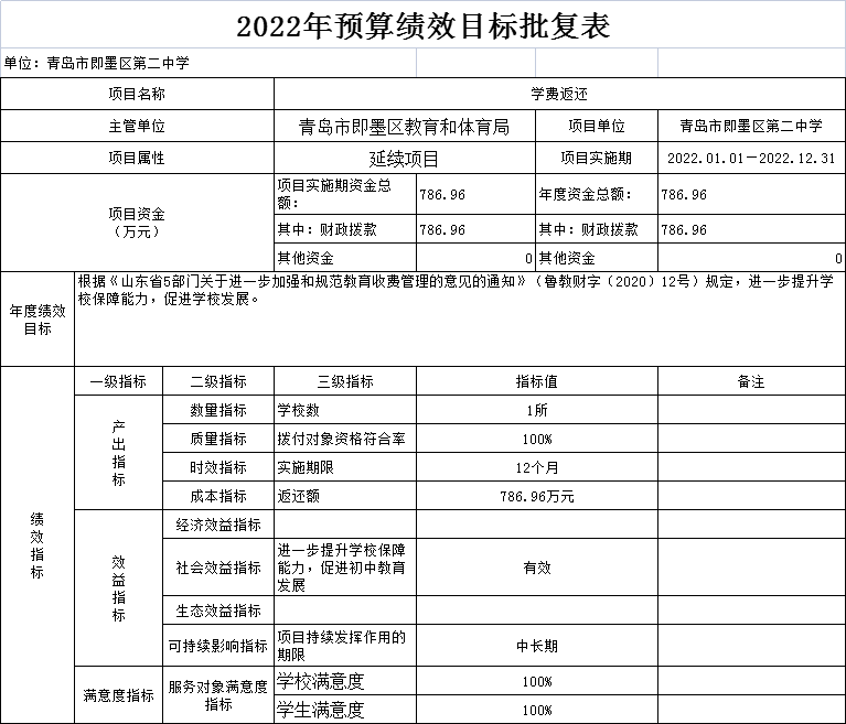 3.学费返还:由青岛市即墨区第二中学单位实施,实施周期为一年,年度预算安排786.96万元,拨付对象资格符合率100%,资金拨付时效及时。根据《山东省5单位关于进一步加强和规范教育收费管理的意见的通知》(鲁教财字〔2020〕12号)规定,进一步提升学校保障能力,促进学校发展。
