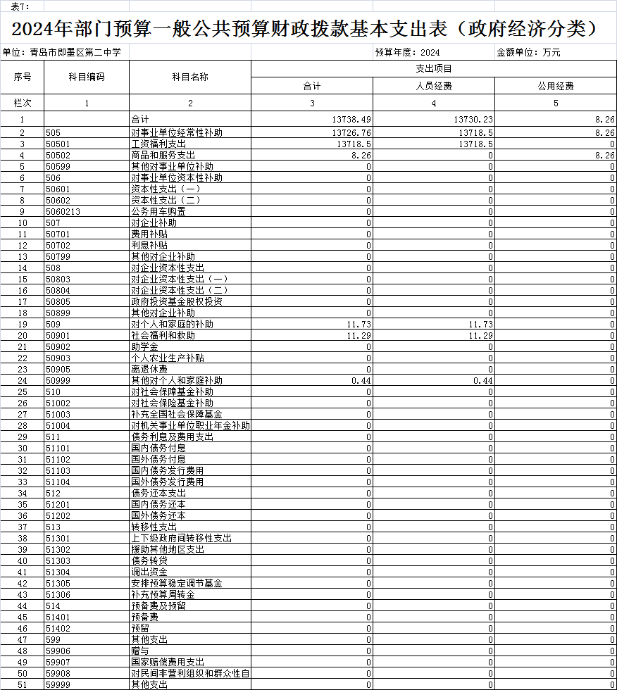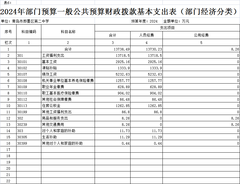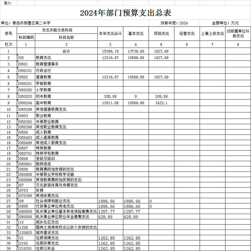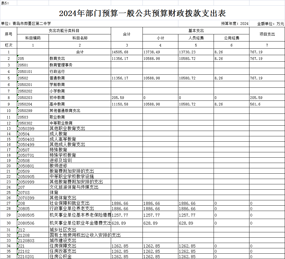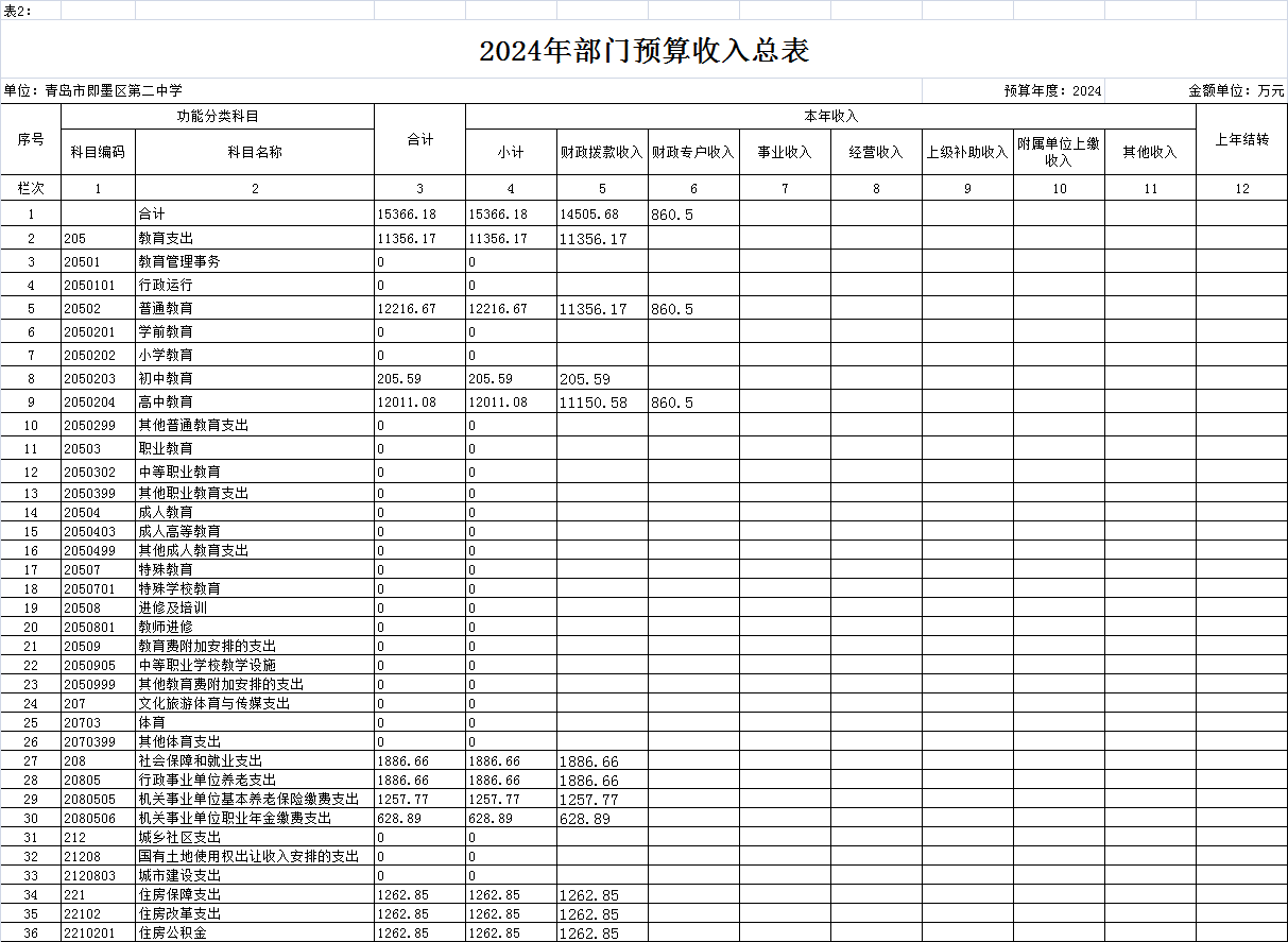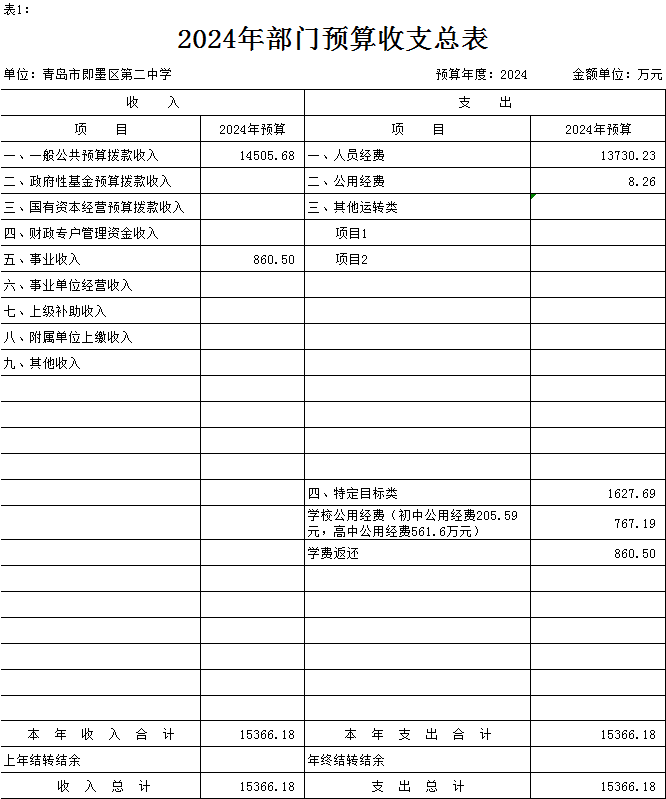 按照综合预算的原则,青岛市即墨区第二中学所有收入和支出均纳入单位预算管理。按照收支平衡原则,青岛市即墨区第二中学2024年收支总预算均为15366.18万元,其中单位收入包括:一般公共预算拨款收入14505.68万元、事业收入860.5万元;支出包括:教育支出12216.67万元、社会保障和就业支出1886.66万元、住房公积金1262.85万元。