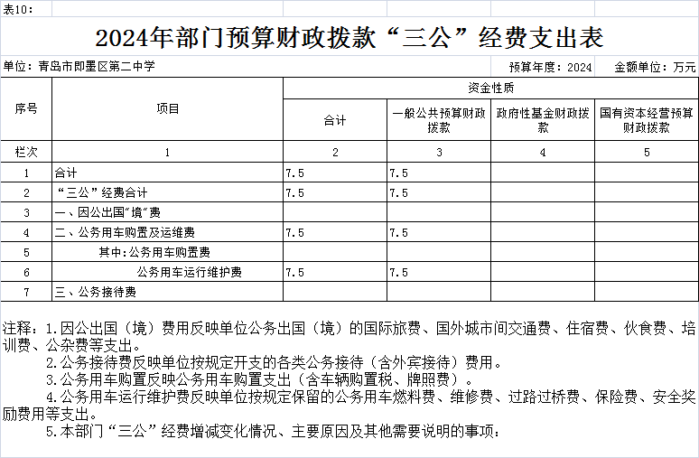 2024年,通过财政拨款安排的“三公”经费预算共7.5万元,比2023年与上年持平。其中:因公出国(境)经费0万元。公务用车运行维护费和购置费7.5万元,公务用车运行维护费7.5万元与上年持平;公务用车购置费0万元,与上年持平。公务接待费0万元,与上年持平。