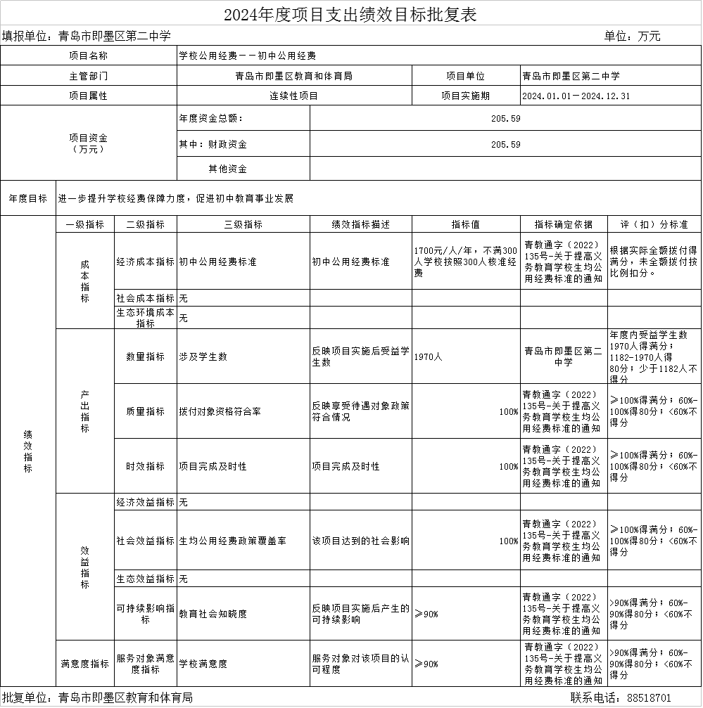 1.初中公用经费:由青岛市即墨区第二中学实施,实施周期为一年,年度预算安排公用经费205.59万元,学生数1970人,公用经费标准1700元/生/年,随班就读11000元/生/年,生均公用经费覆盖率100%,公用经费拨付时效及时。依据《关于以深化教育扶贫为突破口加快推动乡村教育发展的实施方案》的通知(青教通字[2018]80号)和《进一步完善城乡义务教育经费保障机制的通知》(青政发[2016]31号规定,进一步提升学校保障能力,促进初中教育发展。