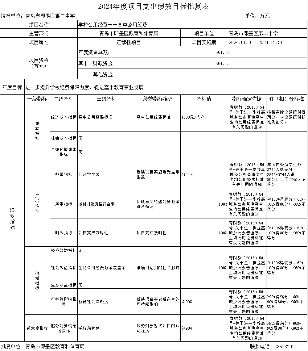 2.高中公用经费:由青岛市即墨区第二中学实施,实施周期为一年,年度预算安排561.6万元,学生数3744人,公用经费标准1500元/生/年,生均公用经费覆盖率100%,公用经费拨付时效及时。依据《关于进一步提高城乡公办普通高中生均公用经费标准有关问题的通知》(青财教〔2015〕54号)规定,进一步提升学校保障能力,促进高中教育发展。