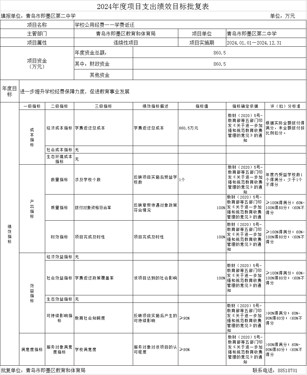 3.学费返还:由青岛市即墨区第二中学单位实施,实施周期为一年,年度预算安排860.5 万元,拨付对象资格符合率100%,资金拨付时效及时。根据《山东省5单位关于进一步加强和规范教育收费管理的意见的通知》(鲁教财字〔2020〕12号)规定,进一步提升学校保障能力,促进学校发展。