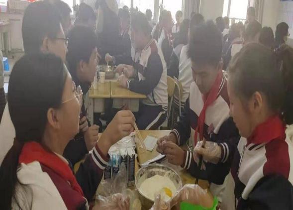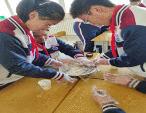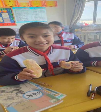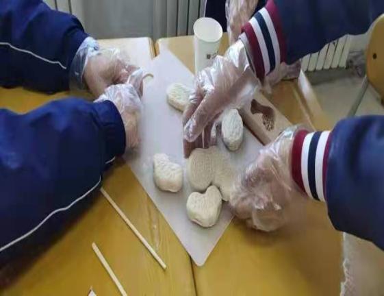 第三步,揉面整形。在整形的过程中,学生们将即墨地区的非物质文化遗产——饽花的制作自行纳入进来。提升学生对本地文化的认识,增加了对家乡的热爱之情。