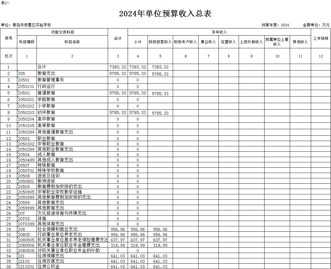 按照综合预算的原则,青岛市即墨区实验学校所有收入和支出均纳入单位预算管理。按照收支平衡原则,青岛市即墨区实验学校2024年收支总预算均为7383.32万元,其中单位收入包括:一般公共预算拨款收入,包括:机关事业单位职业年金缴费支出、机关事业单位基本养老保险缴费支出住房公积金等。