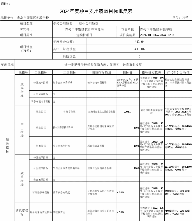 初中公用经费:由青岛市即墨区实验学校实施,实施周期为一年,年度预算安排411.04万元,学生数3305人,随班就读人数 3人,公用经费标准1700元/生/年,随班就读标准17000元/生/年,生均公用经费覆盖率100%,公用经费拨付时效及时。通过初中教育公用经费的保障,促进初中教育发展,促进特殊教育发展,促进民办教育发展,学校保障能力进一步提升。