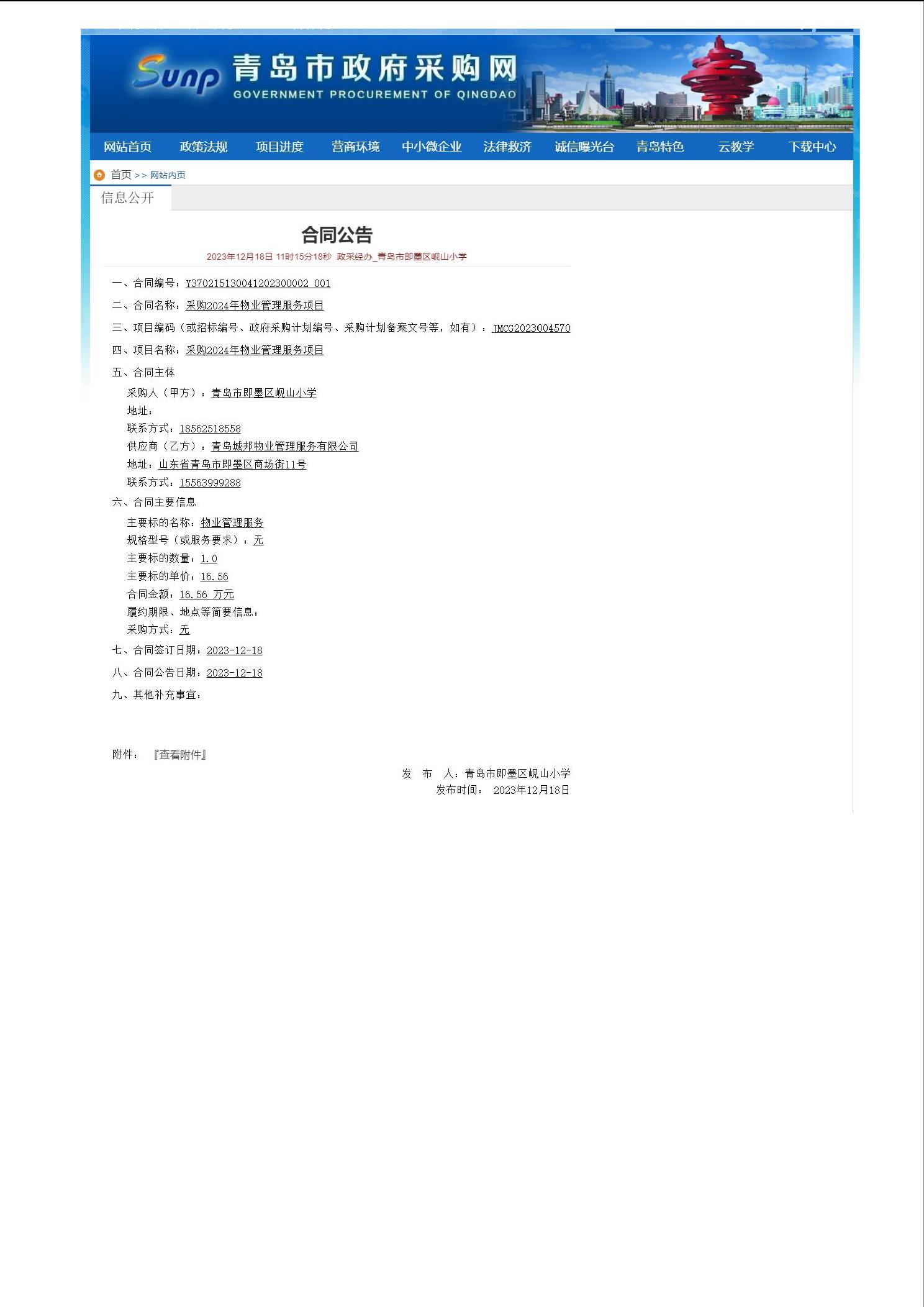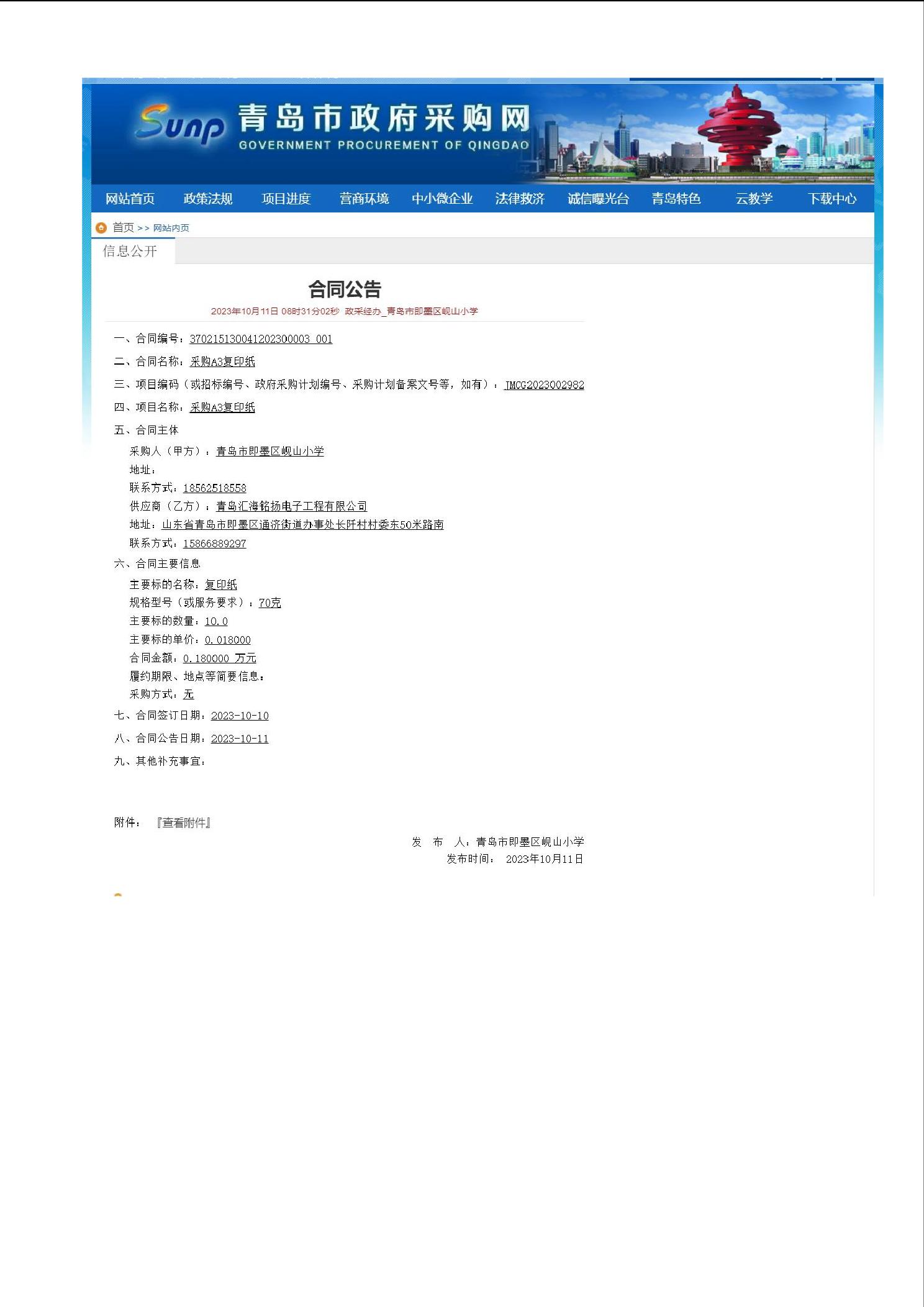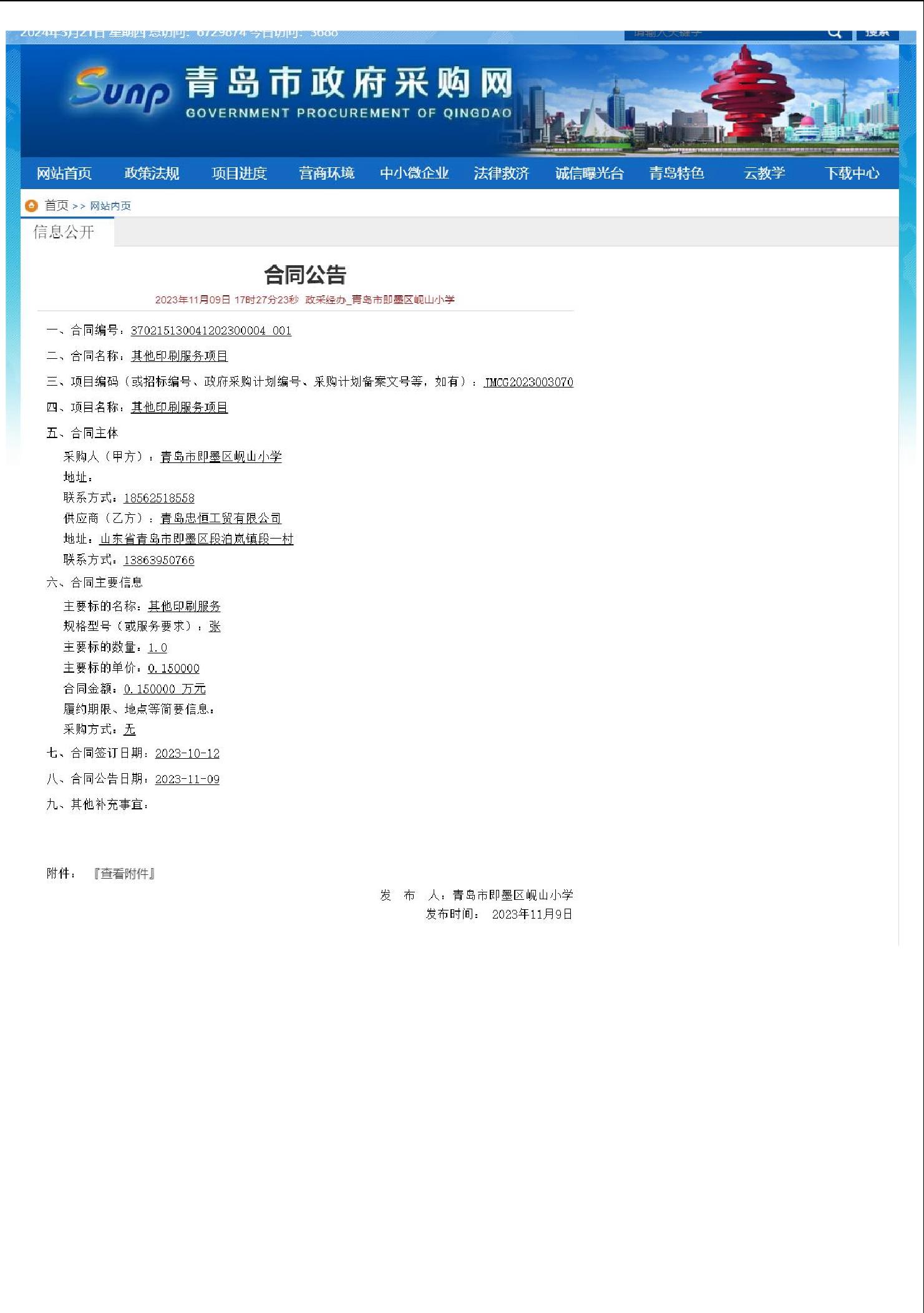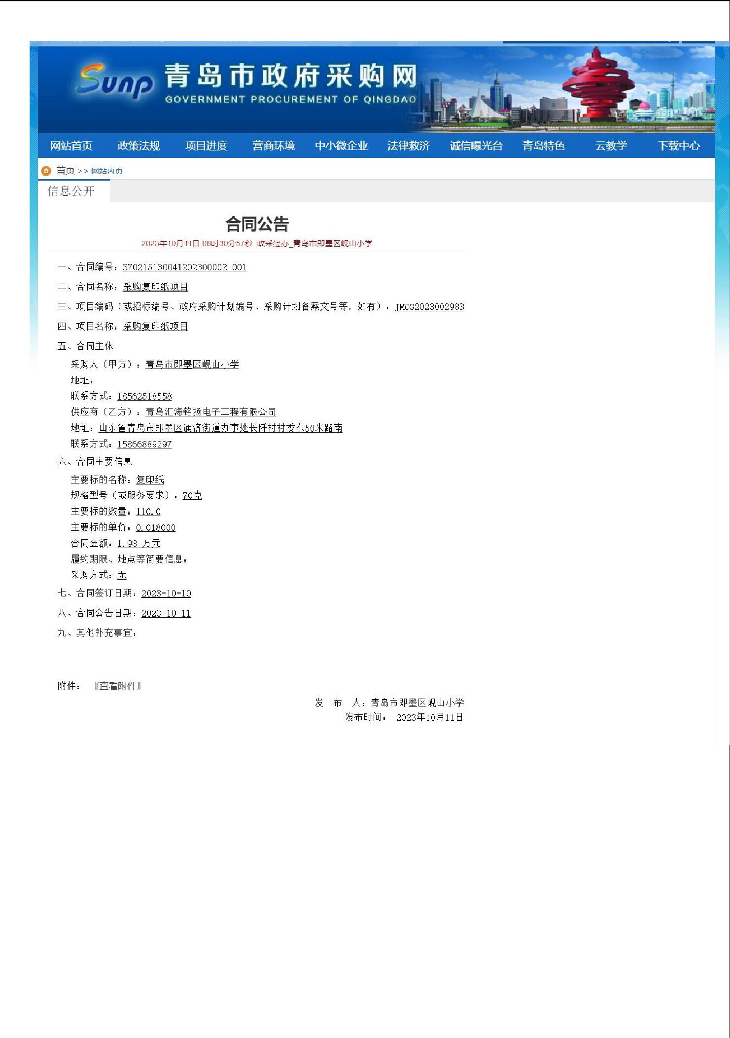 2023年即墨区岘山小学政府采购信息