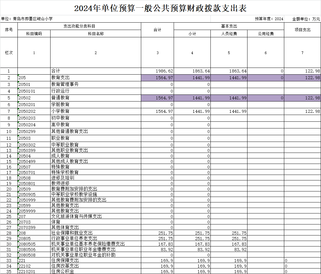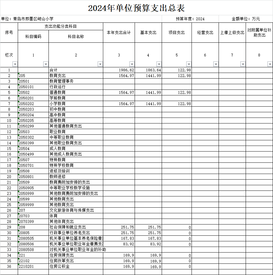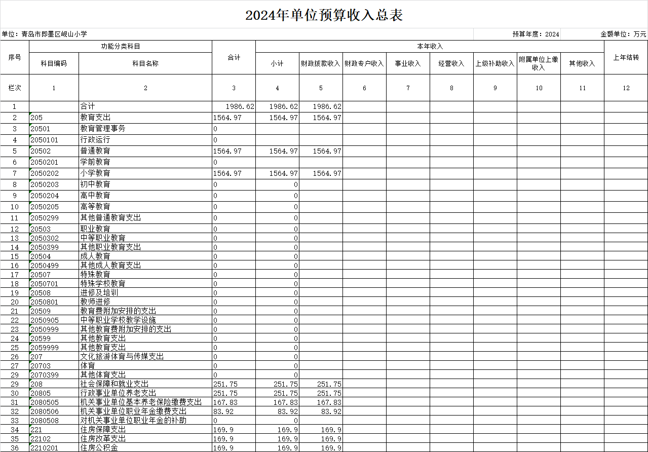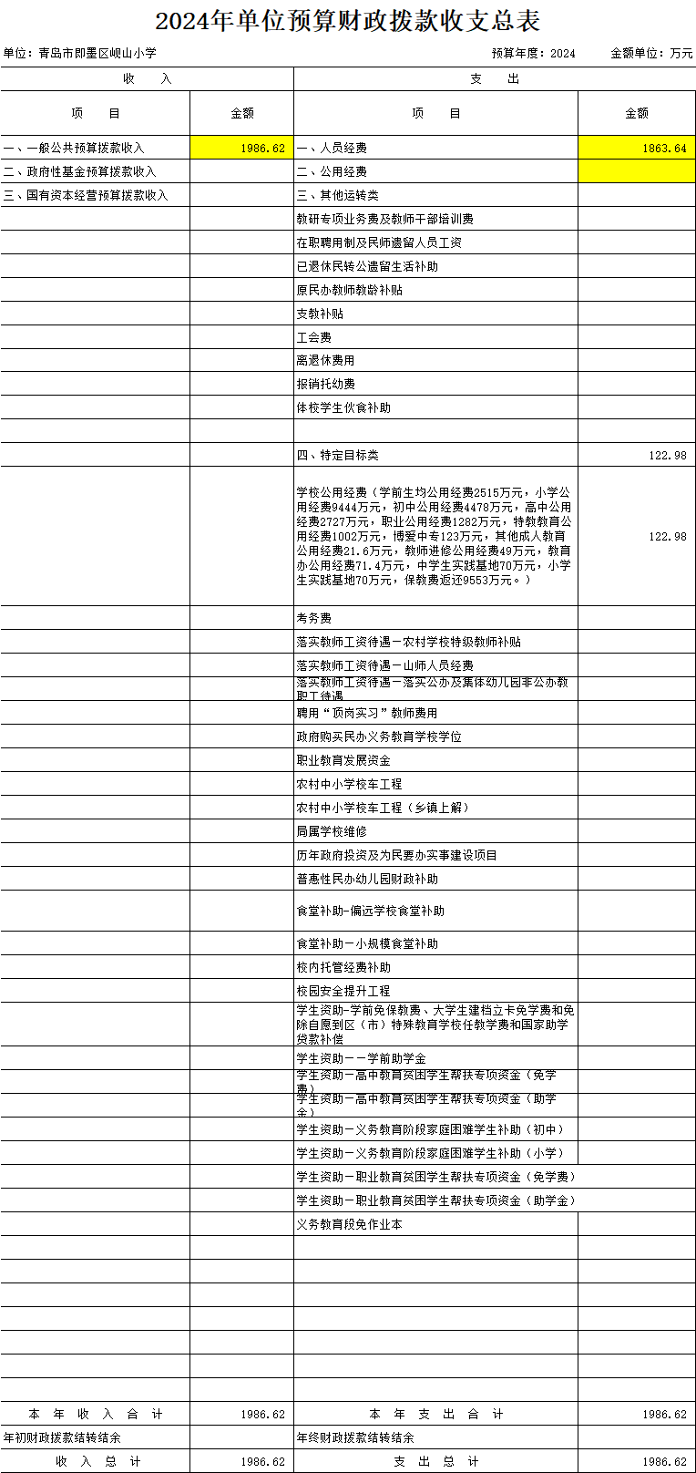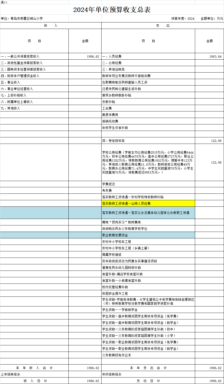 按照综合预算的原则,即墨区岘山小学所有收入和支出均纳入单位预算管理。按照收支平衡原则,即墨区岘山小学2024年收支总预算均为 1986.62 万元,其中单位收入包括:一般公共预算拨款收入。支出包括:小学教育、机关事业单位基本养老保险缴费支出、机关事业单位职业年金缴费支出、住房公积金等。