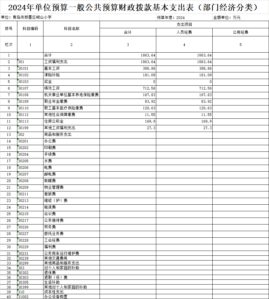 2024年,通过财政拨款安排的基本支出 1863.64 万元,其中: 人员经费1863.64 万元。按单位预算支出经济分类主要包括:基本工资、津贴补贴、绩效工资、机关事业单位基本养老保险缴费、职业年金、职工基本医疗保险缴费、其他社会保障缴费、住房公积金、其他工资福利支出。按政府预算支出经济分类主要包括:工资福利支出。