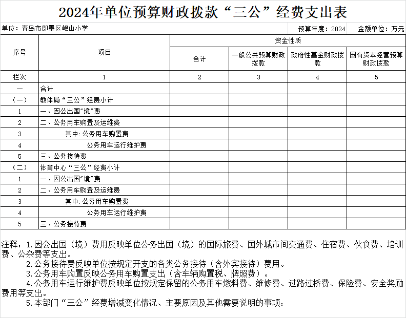 2024年,通过财政拨款安排的“三公”经费预算共 0 万元,与上年持平。其中:因公出国(境)经费 0 万元,与上年持平。公务用车运行维护费和购置费 0 万元,公务用车运行维护费 0 万元,与上年持平;公务用车购置费0 万元,与上年持平。公务接待费 0 万元,与上年持平。