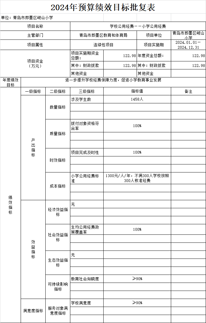 2024年,本单位项目支出全面实施绩效目标管理,涉及预算项目 1 个,预算资金122.98万元,其中财政拨款122.98 万元,绩效目标设置情况是: