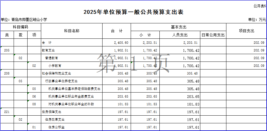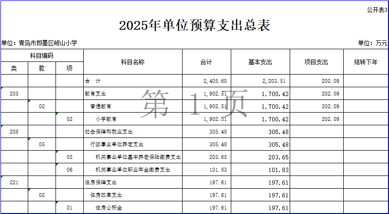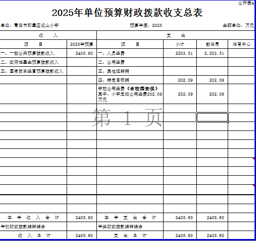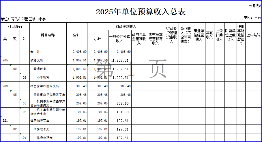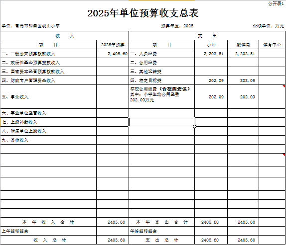 按照综合预算的原则,青岛市即墨区岘山小学所有收入和支出均纳入单位预算管理。按照收支平衡原则,青岛市即墨区岘山小学2025年收支总预算均为2405.60万元,其中单位收入包括:一般公共预算拨款收入;支出包括:小学教育、机关事业单位基本养老保险缴费支出、机关事业单位职业年金缴费支出、住房公积金等。