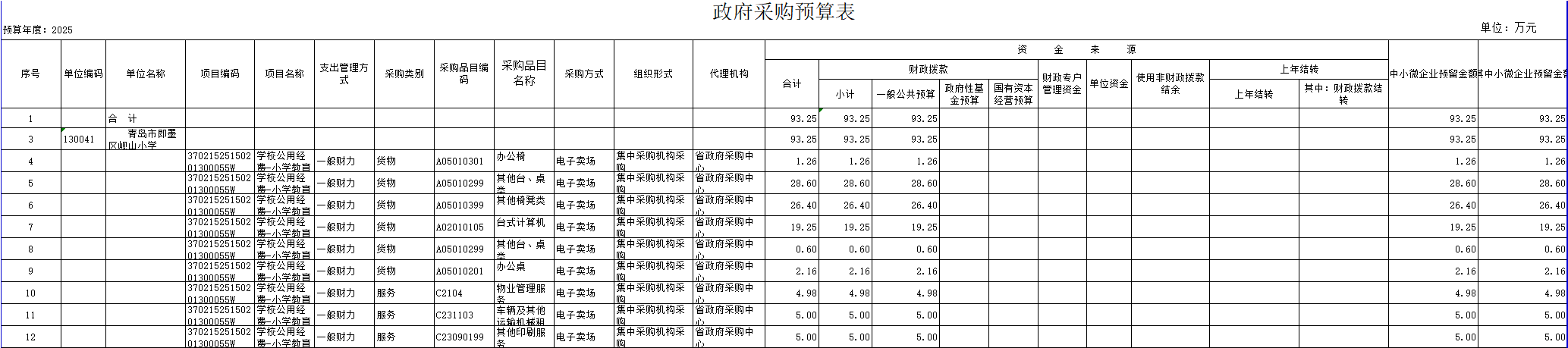 2025年本单位政府采购金额93.25 万元,其中:一般公共预算拨款 93.25万元。政府采购货物78.27万元、政府采购工程 0万元,政府采购服务 14.98 万元。