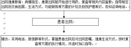 3.出院健康教育:病情稳定、康复出院前开始进行用药、复查等相关内容宣教;指导制定出院后饮食起居、生活方式、功能锻炼等方面的计划及自我护理常识,告知咨询电话。