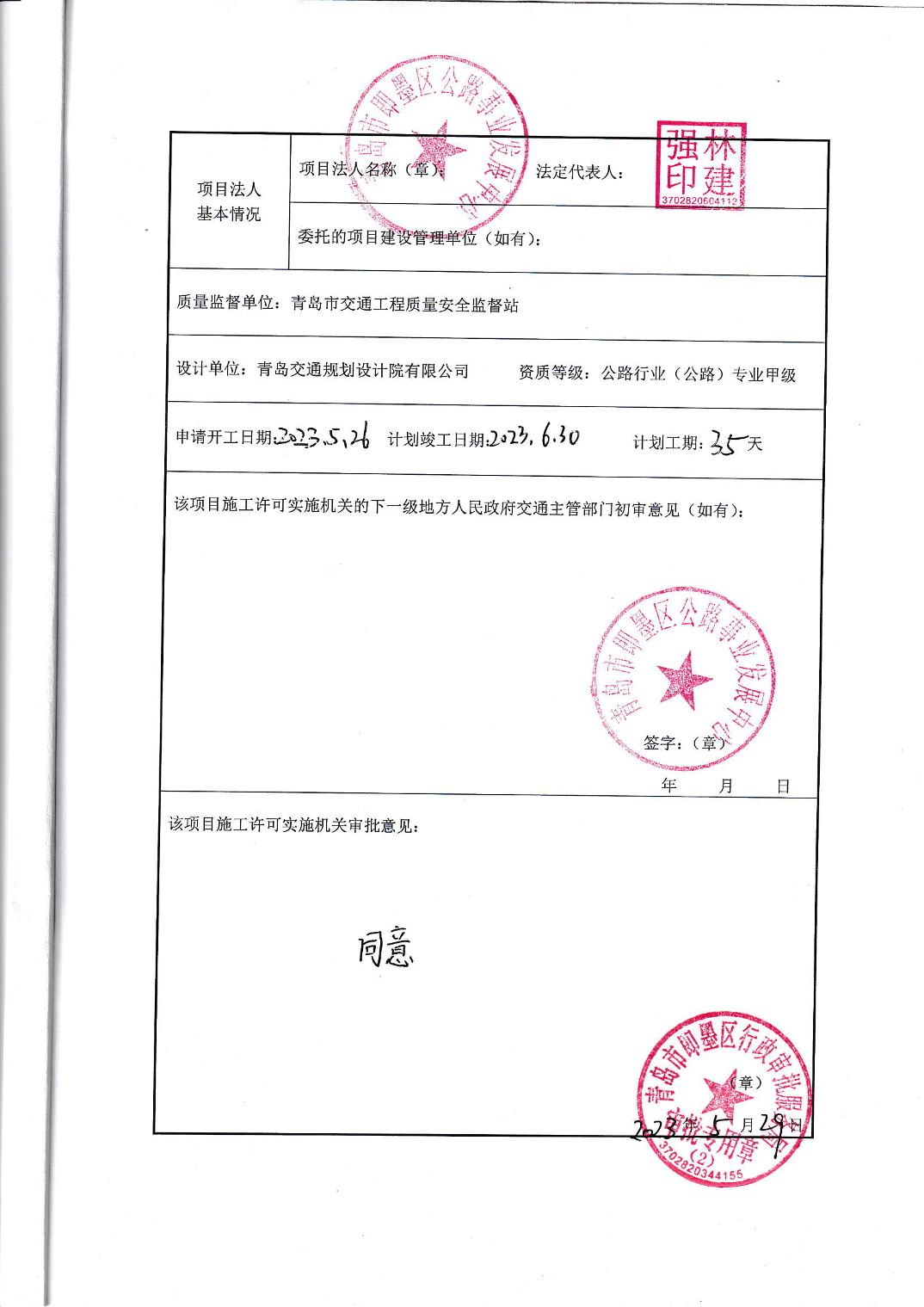 【批准结果信息】即墨区2023年县级公路安全设施整治工程施工许可