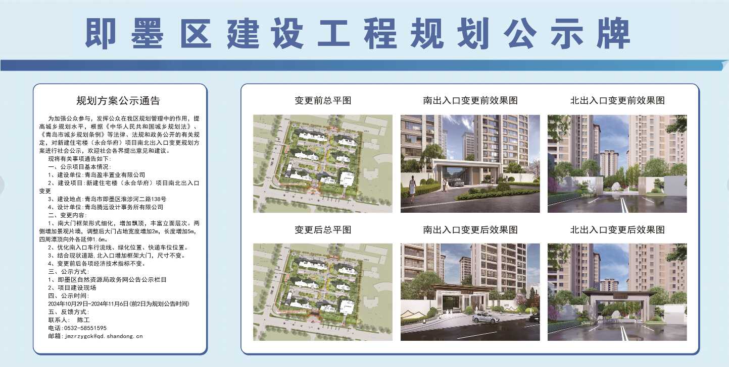 青岛盈丰置业有限公司新建住宅楼(永合华府)项目南北出入口变更规划方案公示通告